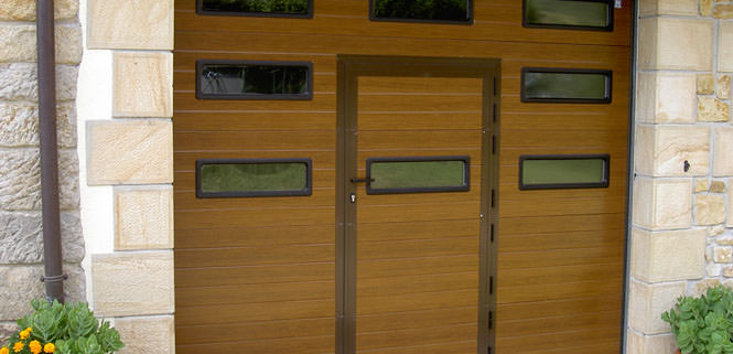 En caso de necesidad, podemos dotar a la puerta residencial de una puerta peatonal incorporada, la cual siempre con apertura hacia el exterior, lleva un sistema de alarma que detiene la puerta residencial cuando la peatonal se abre.